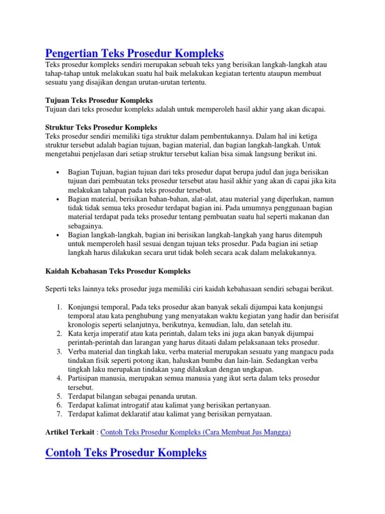 Pengertian teks prosedur kompleks adalah teks yang berisi proses tentang membuat atau mengerjakan sesuatu. · dalam teks prosedur kompleks banyak menggunakan konjungsi temporal atau kata . Contoh teks prosedur bisa terbentuk dari bentuk teks yang dibedakan beberapa jenis. Potonglah botol bekas menjadi dua bagian · 2. Contoh teks prosedur kompleks · 1.