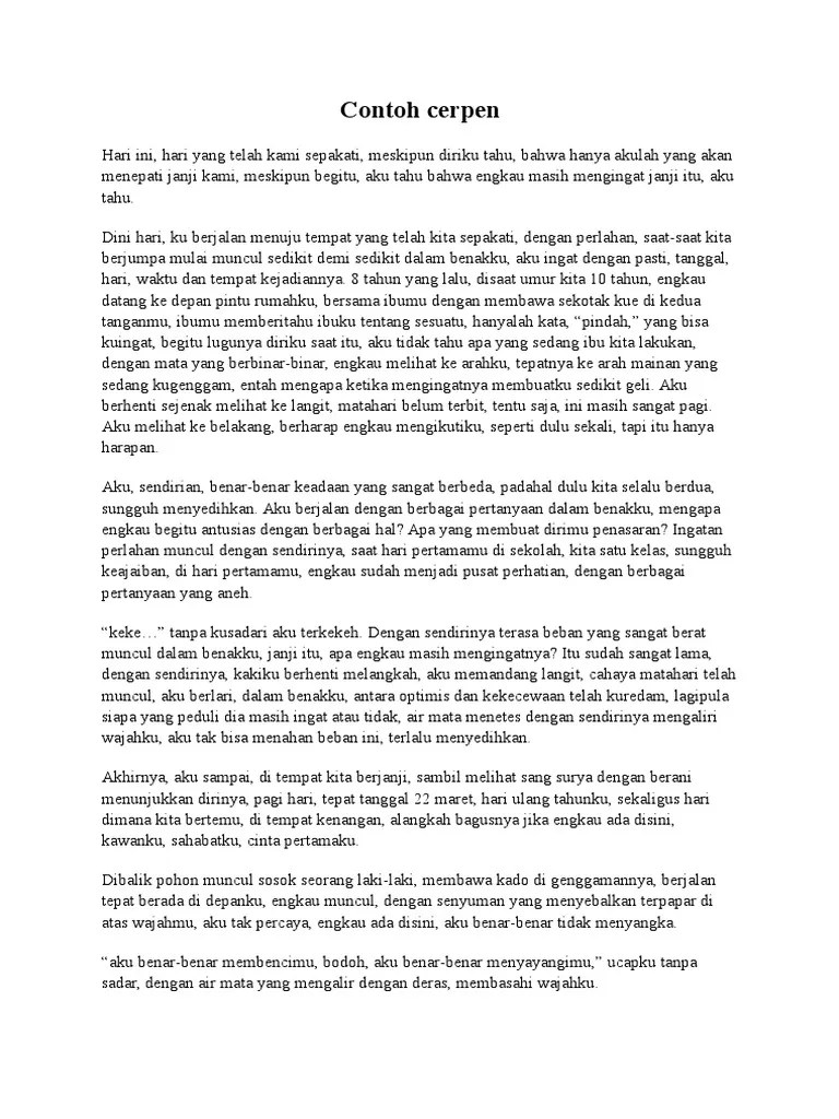 Contoh cerpen terbaik berikut ini adalah salah satu jenis kumpulan cerpen singkat dan menarik untuk kita baca contoh cerpen pendek terbaik. Cerpen adalah singkatan dari cerita pendek atau cerita singkat, cerpen adalah karangan fiktif yang hanya memuat beberapa paragraf, .